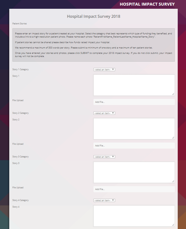 After you have filled out the data section of the survey, click next. You’ll be taken to the second and final section of the survey where you will input your impact stories and upload photos. You can input up to 10 stories and photos.